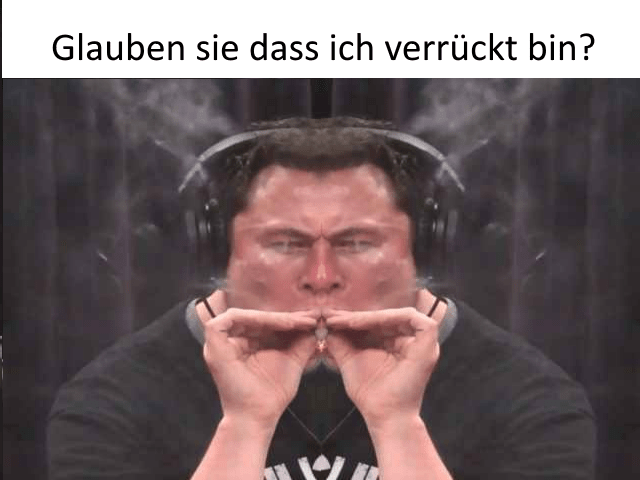 Diese frage stellte mir elon musk gegen eines langen abendessens. Diese frage stellte mir elon musk gegen ende.halt die fresse Glauben sie, dass ich verrückt bin?